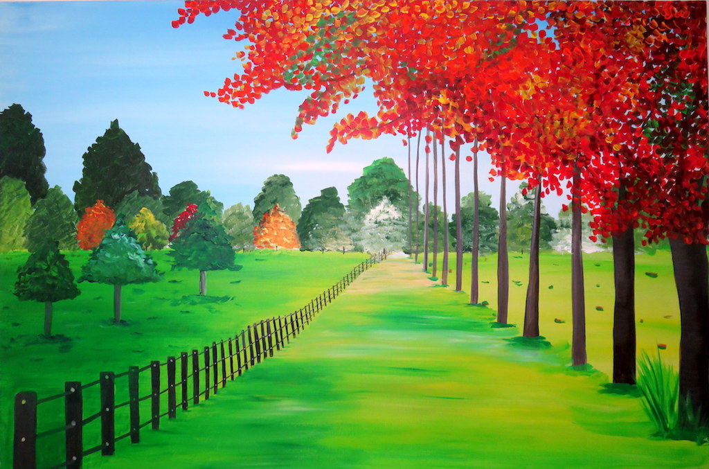 Fine artist quality acrylic colours on canvas. The cool breez and crisp on the road. There is nothing more beautiful to visit countryside in fall.