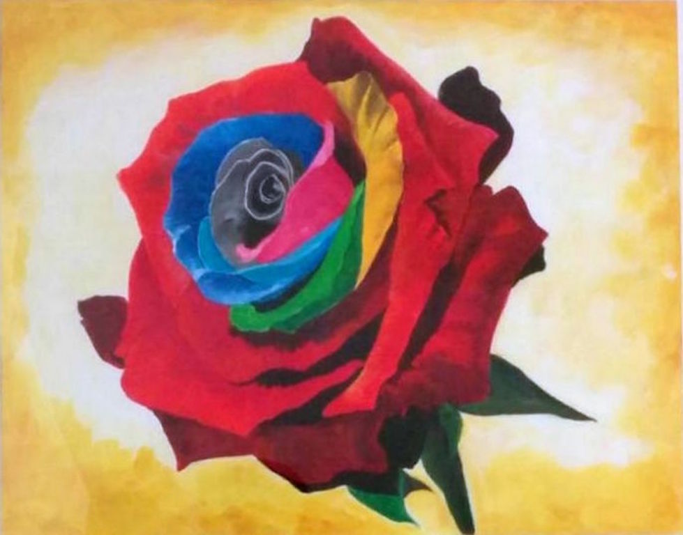 Fine artist quality acrylic painting on canvas. This colourful rose painting is one of my Rainbow Rose series.