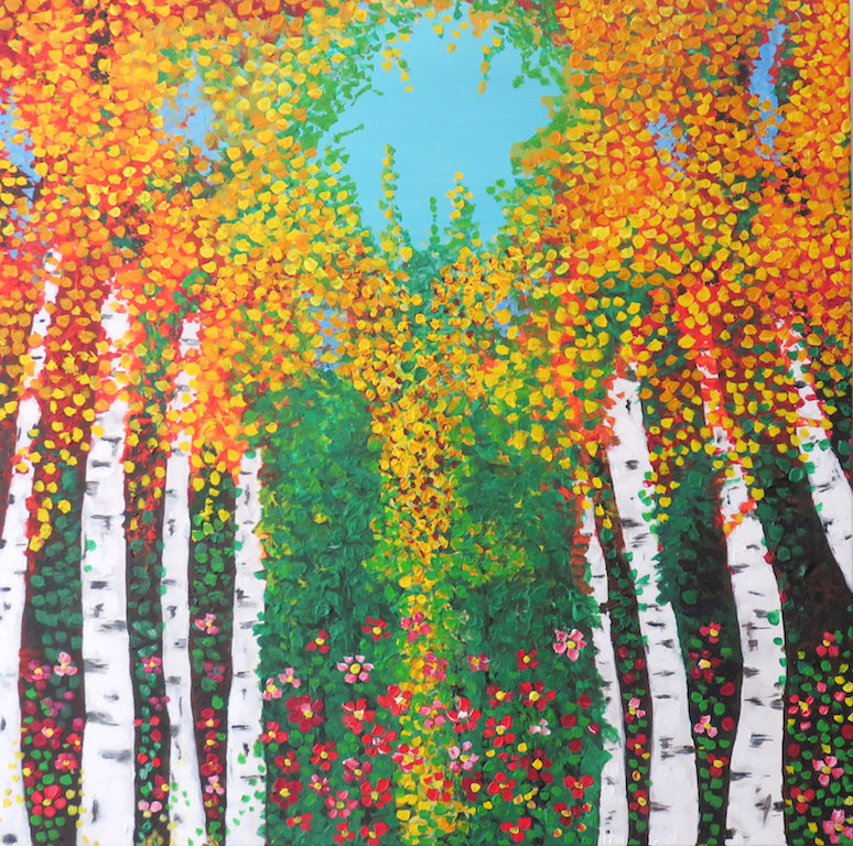 × Golden Birch Trees Fine artist quality acrylic colours on canvas. This is a cheerful painting.I have applied thick golden coat to give more depth to the leaves and where sky is peeking behind the trees. This joyful piece of artwork would give a vibrant look to your place.