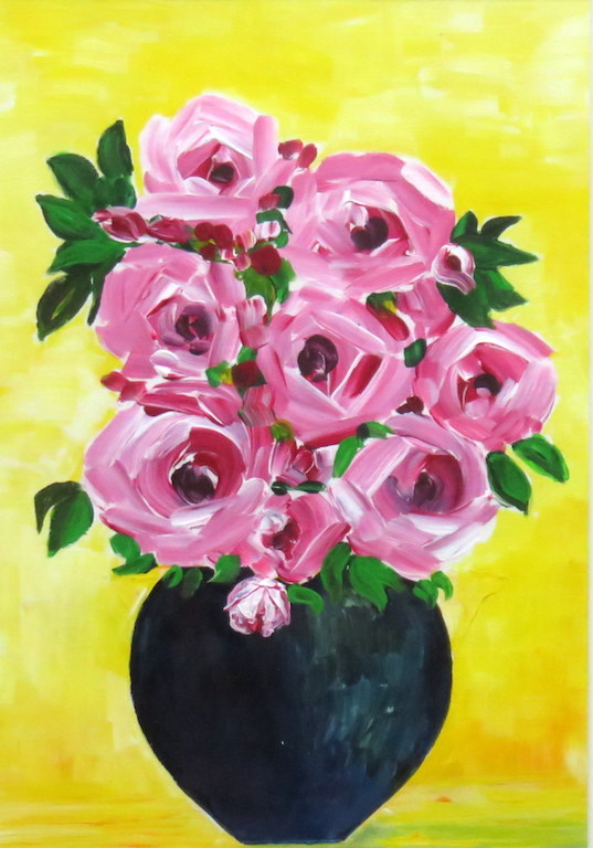 Fine artist quality acryiic painting on canvas. This colourful pink rose pot painting is perfect to make your room more beautiful and lively.